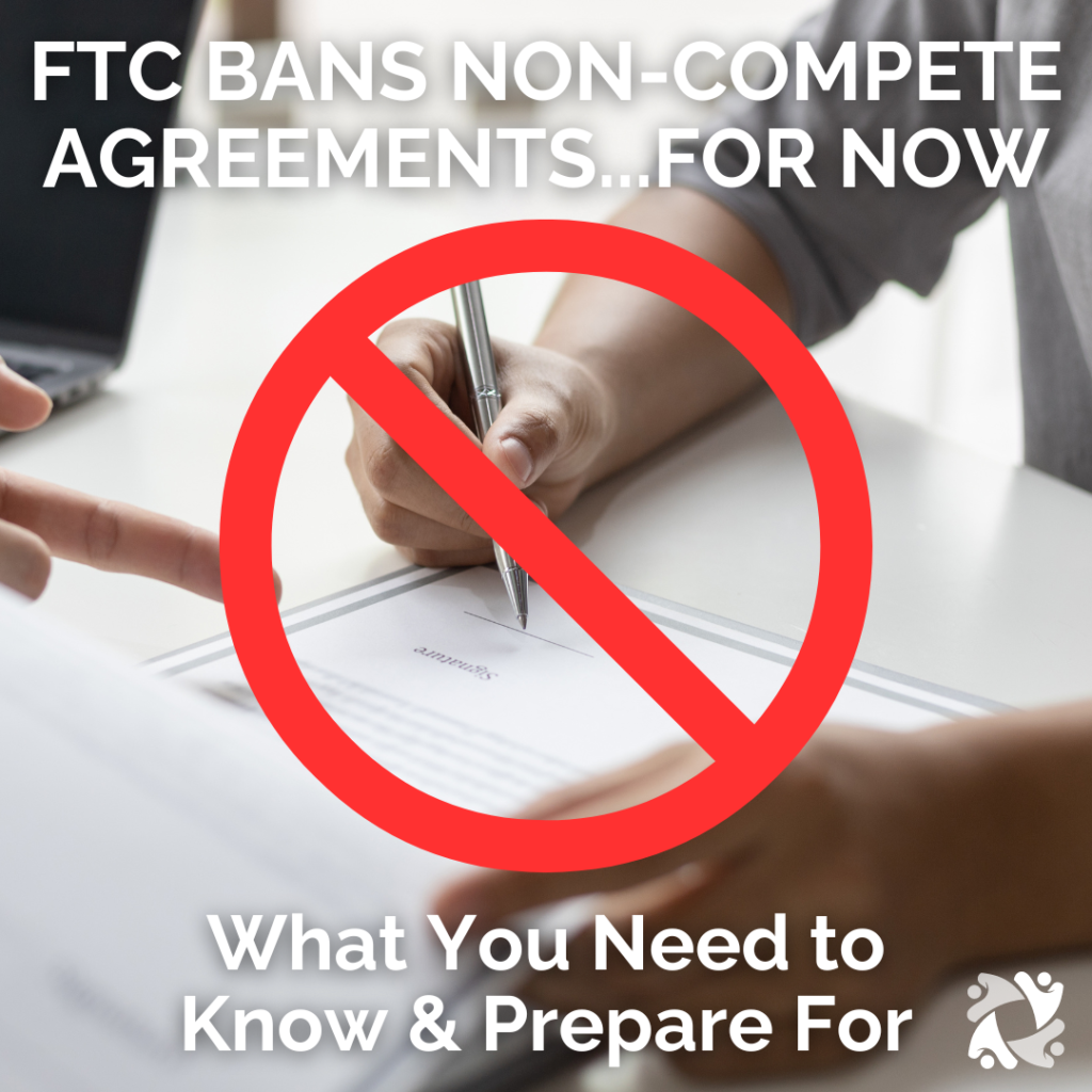 The Federal Trade Commission (FTC) has officially published a rule banning the enforcement of most non-compete agreements in for-profit businesses. However…this rule doesn’t go into effect until September 4, 2024 (so you’ve got some time) and there are injunctions that have been issued to stop the rule from going into effect, so we are watching this one closely! Regardless, it’s important to understand what these rules are, what impacts they have, and how you can start to prepare for the changes.